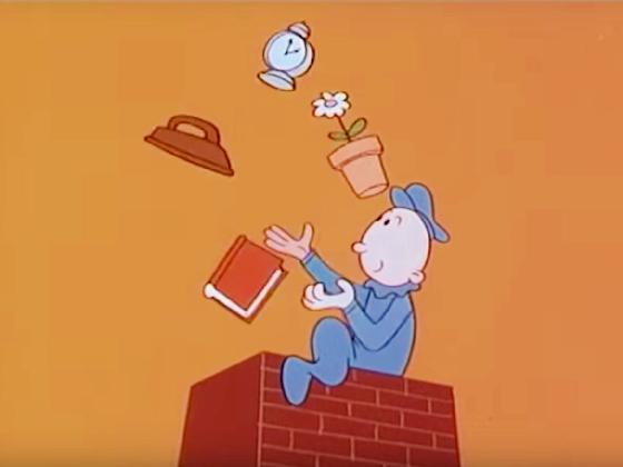 Swee'Pea juggles 10 times throughout this 6 minute cartoon, mostly circular showers of 4 household objects.