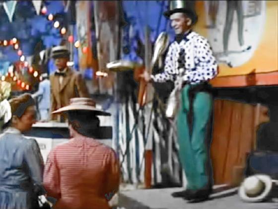 At 07:30, Harry Johnson juggles 3 clubs on a small stage at a carnival, on and off camera for over 2 minutes.