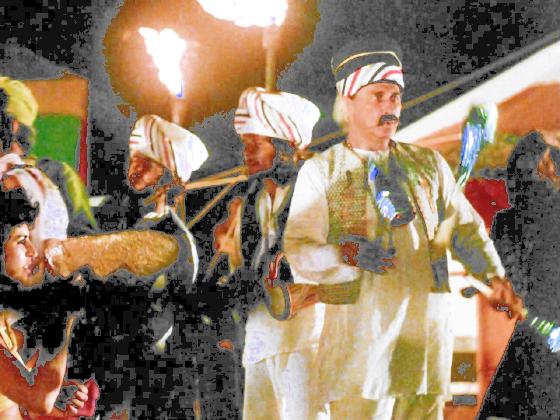 At 40:40, and for about 45 seconds, a large variety of performers are seen at an evening carnival, and a 3 club juggler is seen three times.
