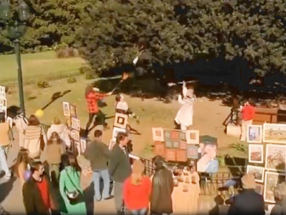At 13:13, Martín Dahab, now dressed as a clown, juggles 3 clubs in the background, and the staff twirler and fire blower are again seen behind him.