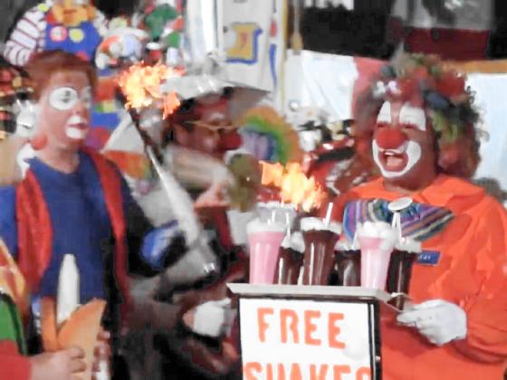 At 1:22:16, there is an almost 7 minute segment during a clown meeting, with quite a lot of juggling in the background, including brief bits of club juggling and passing. One of the "evil enemies" even gets knocked out by a dozen clubs.