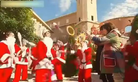 At 1:18:29, and for the next 12 seconds, during a Christmas celebration where many people are dressed in Santa suits, several of the Santas are juggling 3 rings, 3 clubs, or 3 balls.