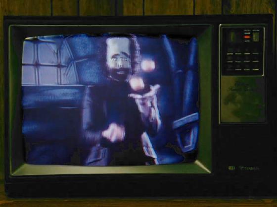 Tobe and Monica are in her mobile home, watching an old VHS tape of a 1980s exploitation movie called Frankenbooty, in 3-D.