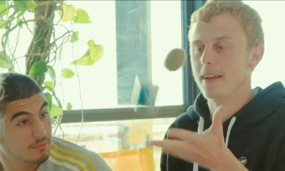 At 1:32:54, while Tony is having lunch at a restaurant with several friends, one of them attempts to juggle a lime, an orange, and a small open container of yogurt, but he soon spills the yogurt on his jacket, causing great amusement to everyone else at the table.