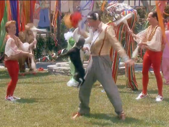 At 1:43:41, in an 80 second circus scene, Chip Lowell and Deon Aumaier juggle 3 clubs each and pass 6 clubs among acrobats, clowns, and other circus performers.