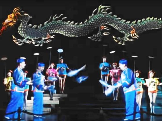 in front of 10 girls spinning plates on sticks, with all dressed in