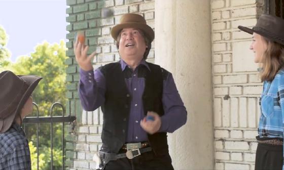 At 07:01, Edward Rollin, playing Larry juggled 3 beanbags to entertain a boy and a girl. He made 3 attempts, each with 3 throws. In the first, he bobbled one catch, but didn't drop. In his second try, he dropped a ball. In his third and last attempt, he caught all 3 balls cleanly.