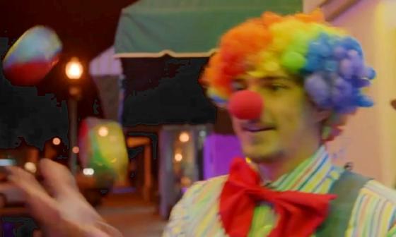 At 0:57:51, Devon Fuller is dressed as a clown and