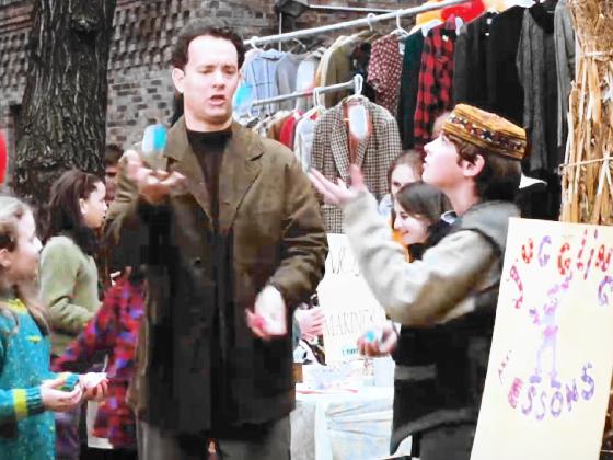 Hallee Hirsh, 10, and Jeffrey Scaperrotta, 5, play Annabelle Fox and Matt Fox, Joe's kids. Joe takes them to a street fair, where they meet a boy giving juggling lessons, played by Nick Brown, and credited as juggler.