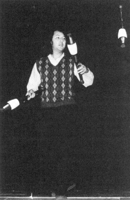 Peter Jurcenko was working with a friend on a six club passing pattern where they exchanged hats while saying, "put the club between your legs, take the hat off your head, throw the hat to the other guy, put the hat on your head, make it look stylish and juggle." Jurcenko credited the routine to the Down to Earth Jugglers from Madison, Wis. A few games of combat juggling rounded out the night. One of the winners was 1987 second place juniors champ David Cain.
