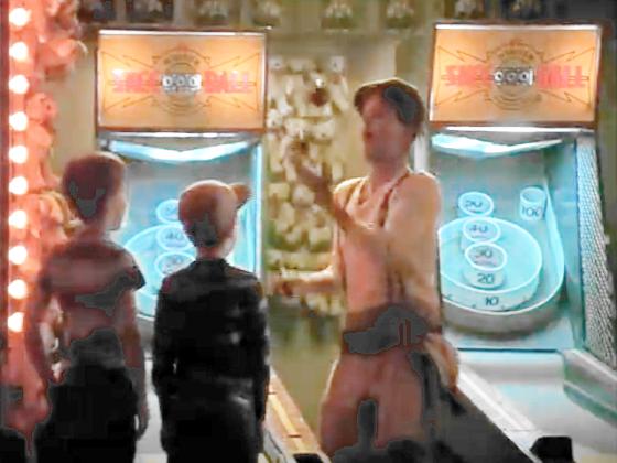 At 12:39, Steven Grayhm, playing the young Eddie character, shows two young boys how he can juggle 3 balls from a Skee-Ball game.
