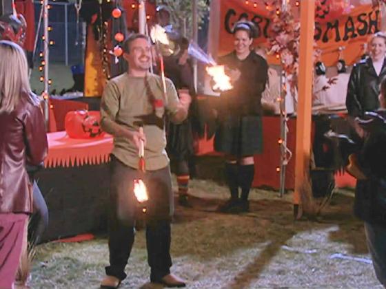 At 1:07:35, Brent Johnson juggles 3 torches in the initial Halloween Carnival scene. As the scene progresses and the haunted house mannequins are brought to life, a zombie chases the juggler away, and a torch is dropped, which is then used to set a booth on fire.