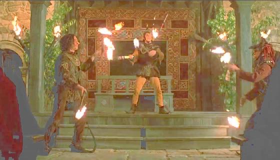 At 1:06:13, during the festivities surrounding the play Hamlet created to expose his murdering uncle, we see a trio of jugglers appear and begin with a bit of acrobatics for 20 seconds.