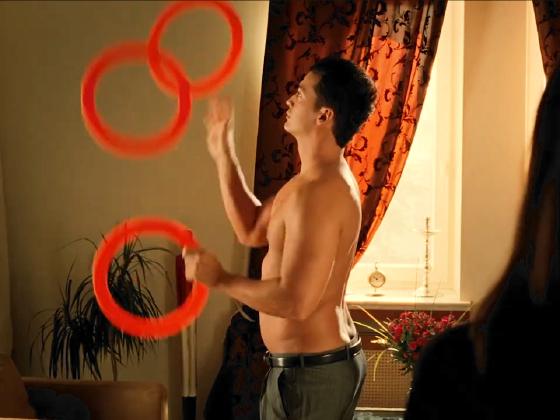 At 21:23, Monia (Magdalena Rózczka) enters the apartment of her friend Korba (Anna Dereszowska) and sees Korba's boyfriend, played by Rafał Cieszyński, shirtless and overweight, juggling 3 rings, but dropping. This conversation occurs:
