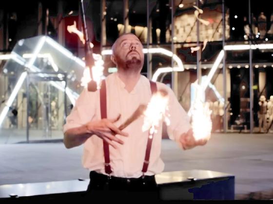 At 1:23:22, Alex Dandridge, stand-in for Eddie Izzard, juggles 3 torches, seen on and off for about 40 seconds.