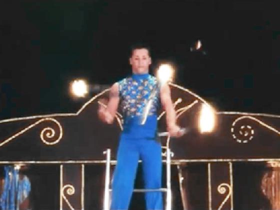 At 1:18:33, during the closing credits, we see Leandro Díaz struggling to learn to stay atop a freestanding ladder, but then falling from it, and then successfully juggling 3 torches while on it.