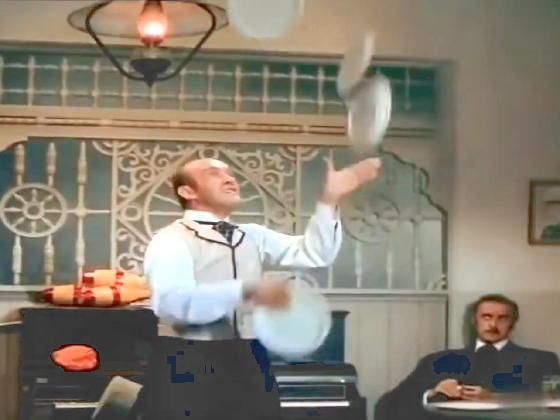 At 53:55, Juggler Val Setz performs as The Great Balso at the opening of the new Palace Saloon. He juggles 4 plates well in multiple patterns, but when he drops, he quips, "I haven't always been this good." The audience just stares quietly. Someone asks the owner, "How much you paying this guy?" The owner answers, "Nothin'." His friend replies, "Too much." Balso then kicks up 4 coins, one at a time, to his mouth, forehead, and each eye, but fumbles a bit. The audience again just stares silently. Balso then says, "I thank you," for the expected applause that was not received. He then juggles a top hat and cane, but when he tries to leave prematurely, the owner yells with gun in hand, "Get back here! You're not much, but you're all we've got."