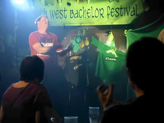 At 1:02:44, during a talent show at the South West Bachelor Festival, Danny Rogers juggles 3 balls briefly, poorly, and drops.