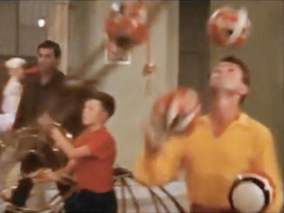 At 0:04:13, a man juggles 3 large balls while bouncing another one on his forehead, seen only briefly as we pass him by. But 18 seconds later, we see him again for 8 seconds.