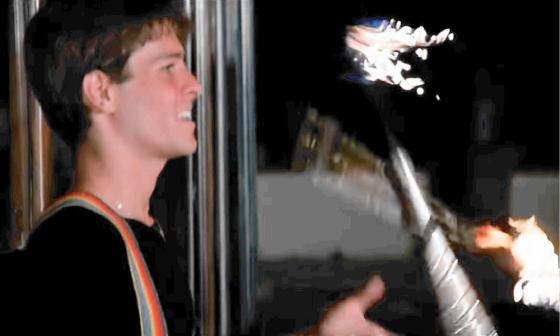 At 37:37, in an evening street scene, John Travolta walks past a street performer juggling 3 torches in front of a corner store.