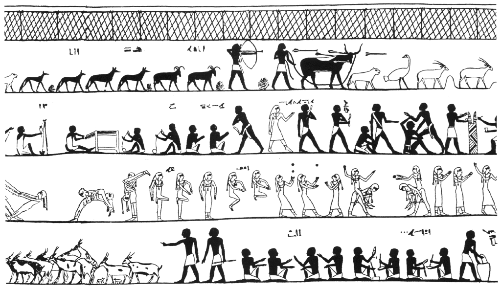 [juggling hieroglyphics]Evidence of the art of juggling can be found for the ancient civilizations of Egypt (especially in the paintings in the Beni-Hassan tombs), India, China, Japan, Iran, and even for the Aztecs and American Indians. Many of these dexterous practices were associated with religious rituals, and the presence of juggling skills among shamans in many of today's preliterate societies suggests a religious origin for them.