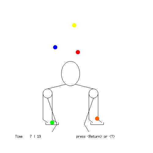 This is Juggle, v1.0, by Glenn Hutchings, zondo@hunting2.demon.co.uk, and is yet another site swap animation program, You can specify the pattern for it to display, or tell it to pick a random one. Juggle comes with a standard curses display and a Silicon Graphics IRIS GL display, but no X interface yet. Juggle sprang up from a great article in a March 1995 issue of New Scientist, by Ian Stewart.